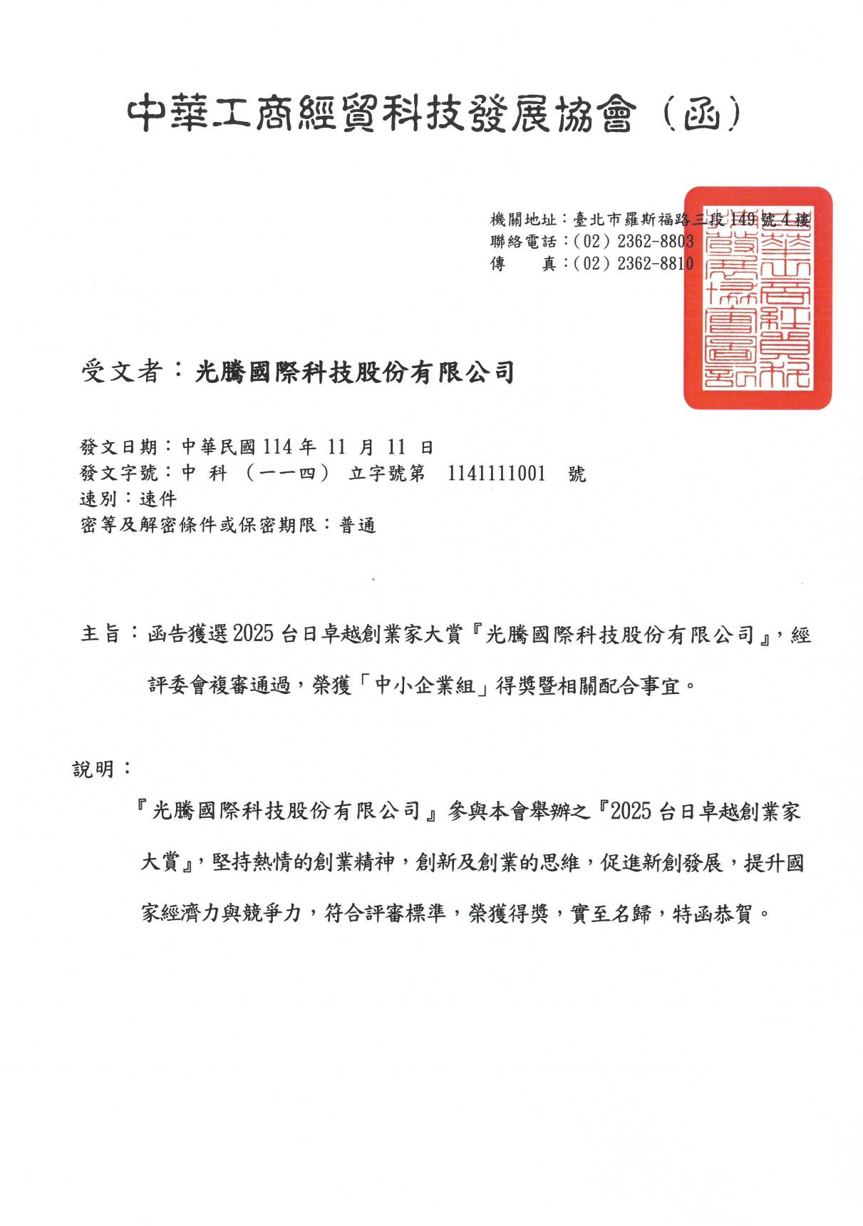 光騰國際科技股份有限公司於「2025 台日卓越創業家大賞」中,榮獲中華工商經貿科技發展協會頒發之「中小企業組」獎項,